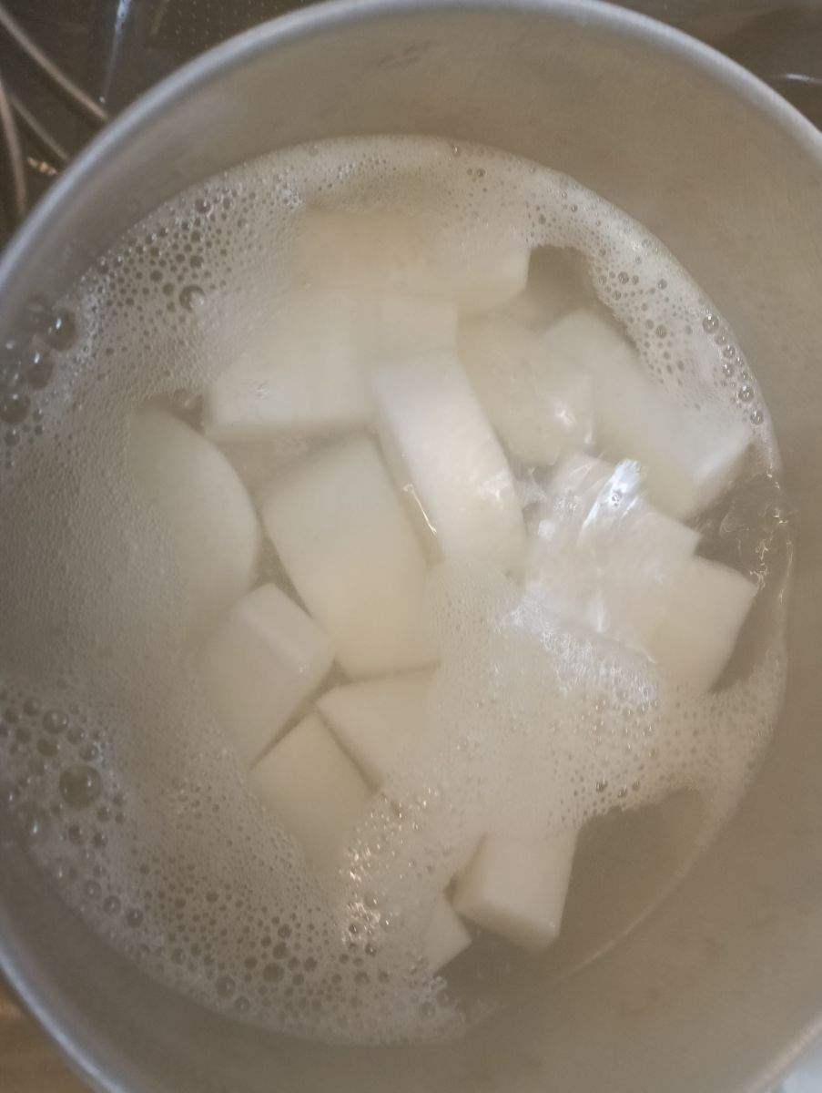 鰤アラが値引きになっていて、大根も安かったので鰤大根を煮る