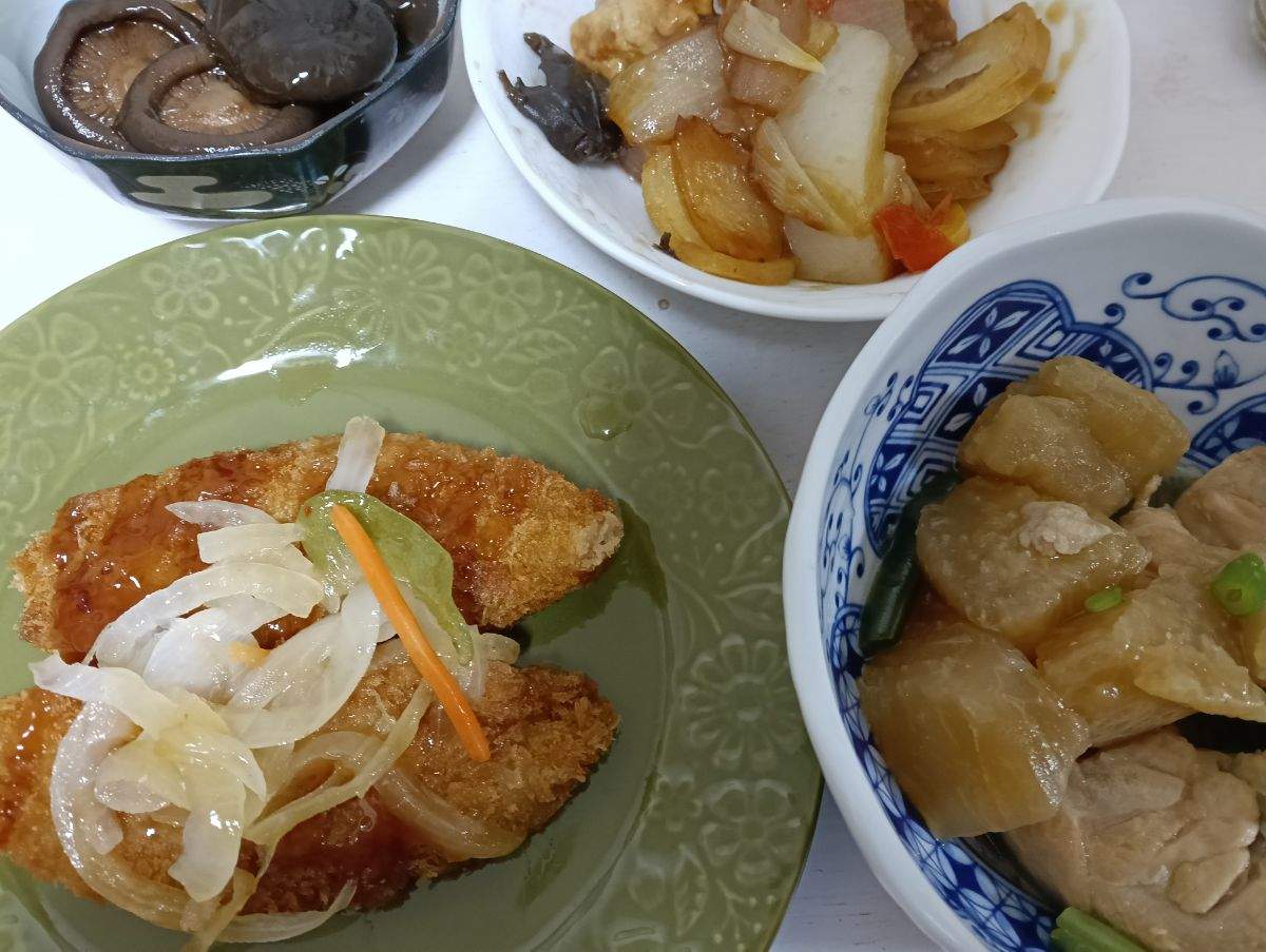 夕 魚天ぷら甘酢あんかけ 酢豚 椎茸うま煮 大根の煮物