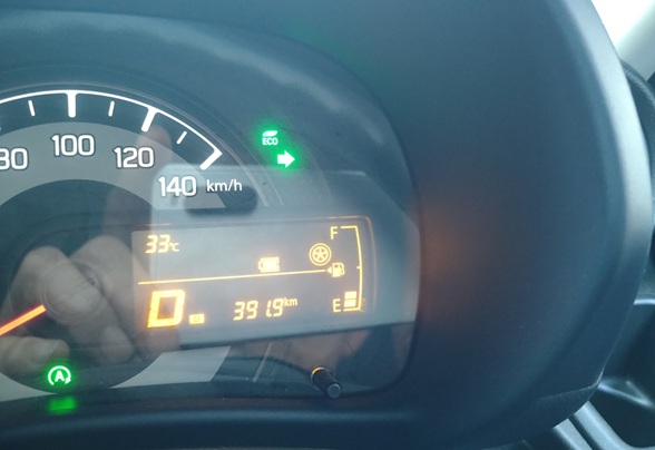1度400kmという表示を見たくて 我慢していたが もう空に近い 諦め給油にゆこう